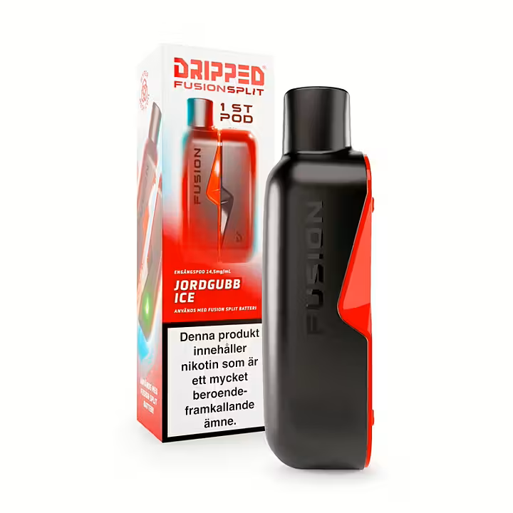Dripped Fusion Split Pod Jordgubb Ice är en förfylld podd som används tillsammans med Dripped Fusion Split Batteri. Podden säljs styckvis och innehåller 14.5mg nikotinsalt.