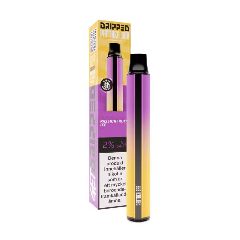 Dripped Panther Bar Passionfruit Ice har en smak av passionsfrukt och Ice (kylning). NIKOTINSTYRKA: 20mg/ml