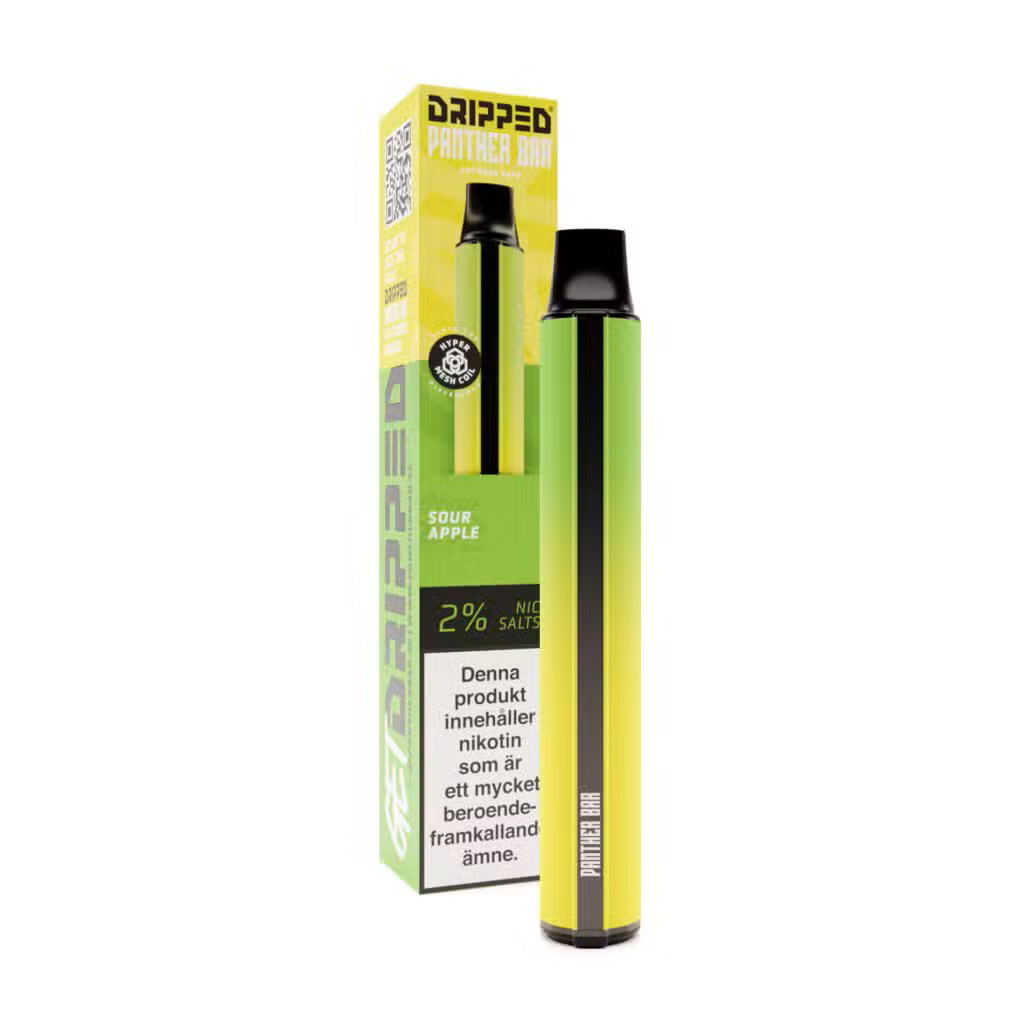 Dripped Panther Bar Sour Apple med en smak av sura äpplen. NIKOTINSTYRKA: 20mg/ml