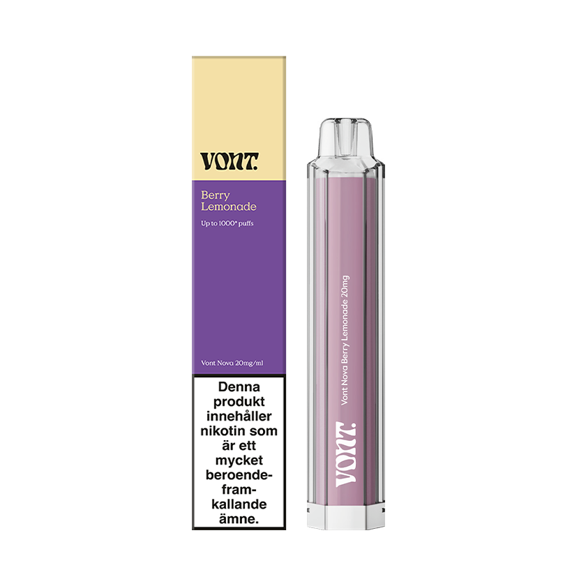 Vont Nova Berry Lemonade med smak av blandade bär och lemnonad. Produkten räcker till omkring 1000 puffar. NIKOTINSTYRKA: 20mg/ml