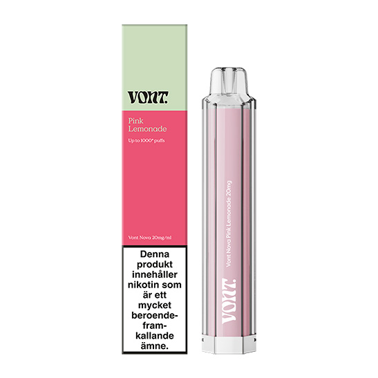 Vont Nova Pink Lemonade har en fruktig smak och en touch av lemonad. Produkten räcker till omkring 1000 puffar. NIKOTINSTYRKA: 20mg/ml