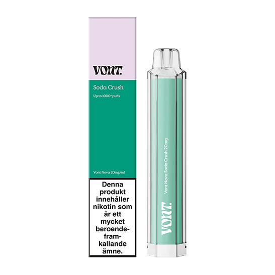 Vont Nova Soda Crush med en smak av sockerdricka och citrus. Produkten räcker till omkring 1000 puffar. NIKOTINSTYRKA: 20mg/ml