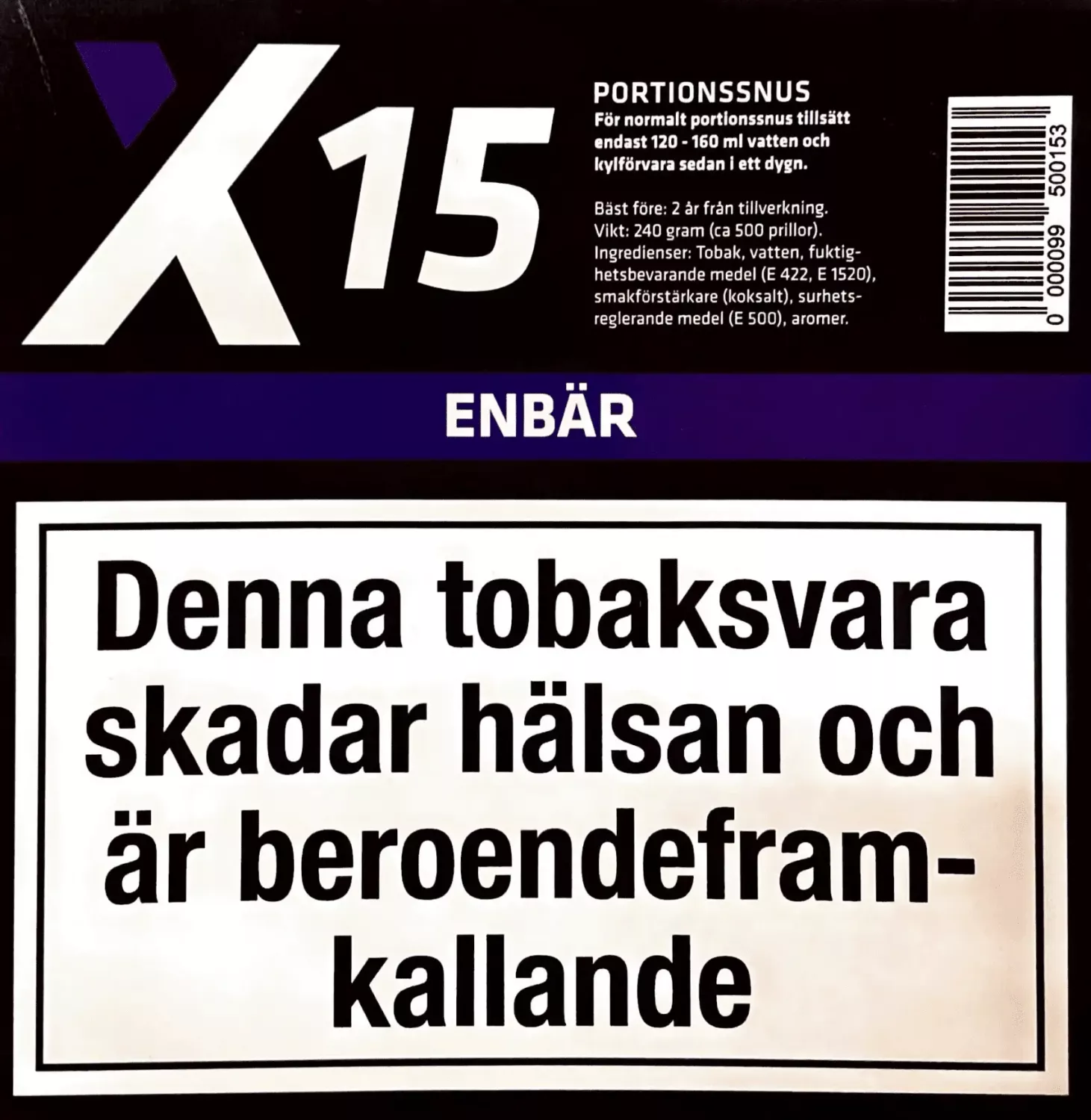 NY VIKT 160g! X-15 Enbär är en snussats som kommer med en unik och härlig smak av enbär. Denna snussats innehåller cirka 500 prillor och ger en långvarig smakupplevelse för användaren. Prillorna är tillverkade av högkvalitativ tobak och är mjuka och sköna att ha under läppen.