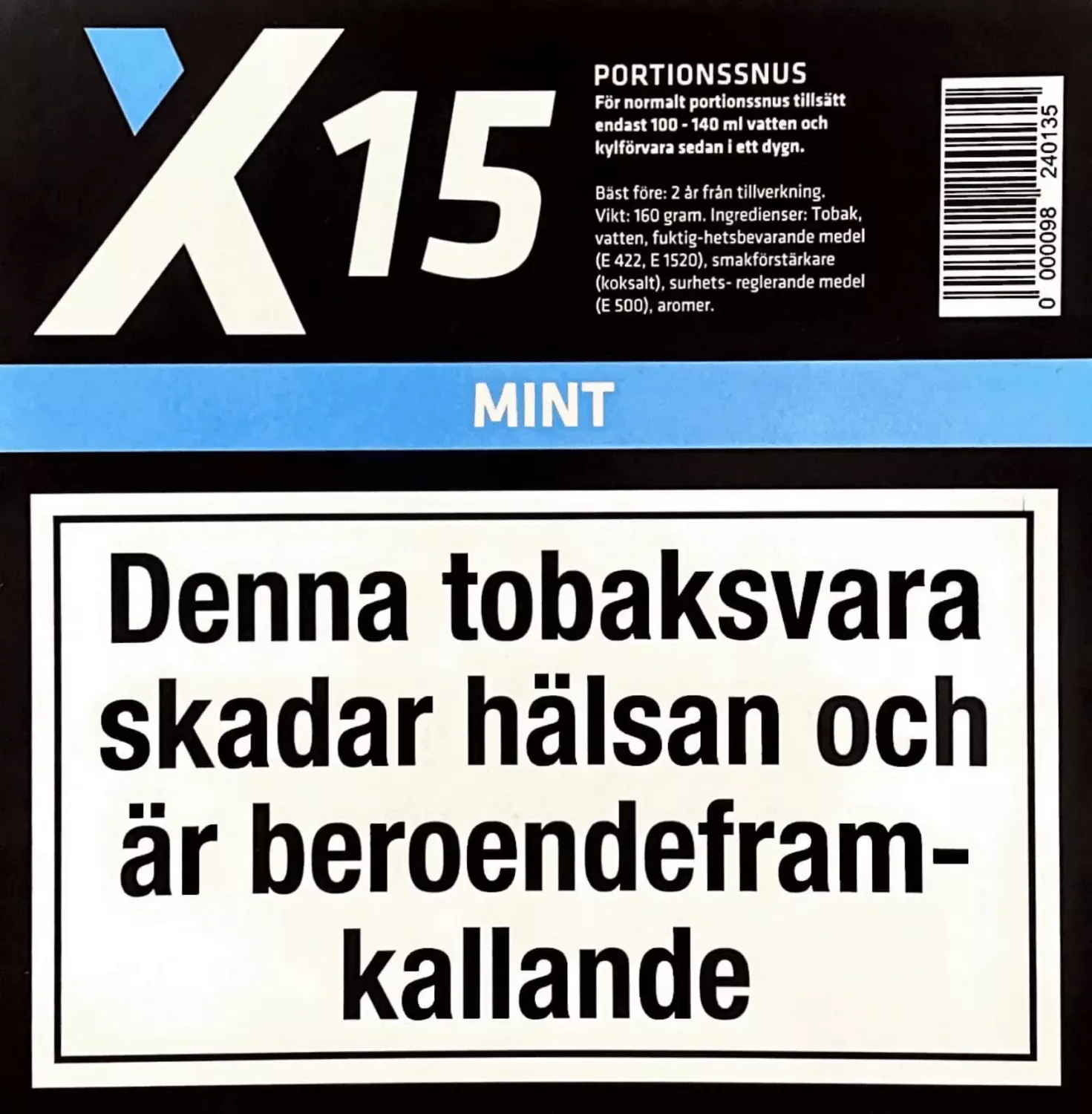 NY VIKT 160g! X-15 Mint: Denna snusblandning erbjuder en uppfriskande smak av mynta som är perfekt för dem som gillar en svalkande känsla i munnen. Den har en stark och uppiggande smak som säkerligen kommer att lämna dig utvilad.