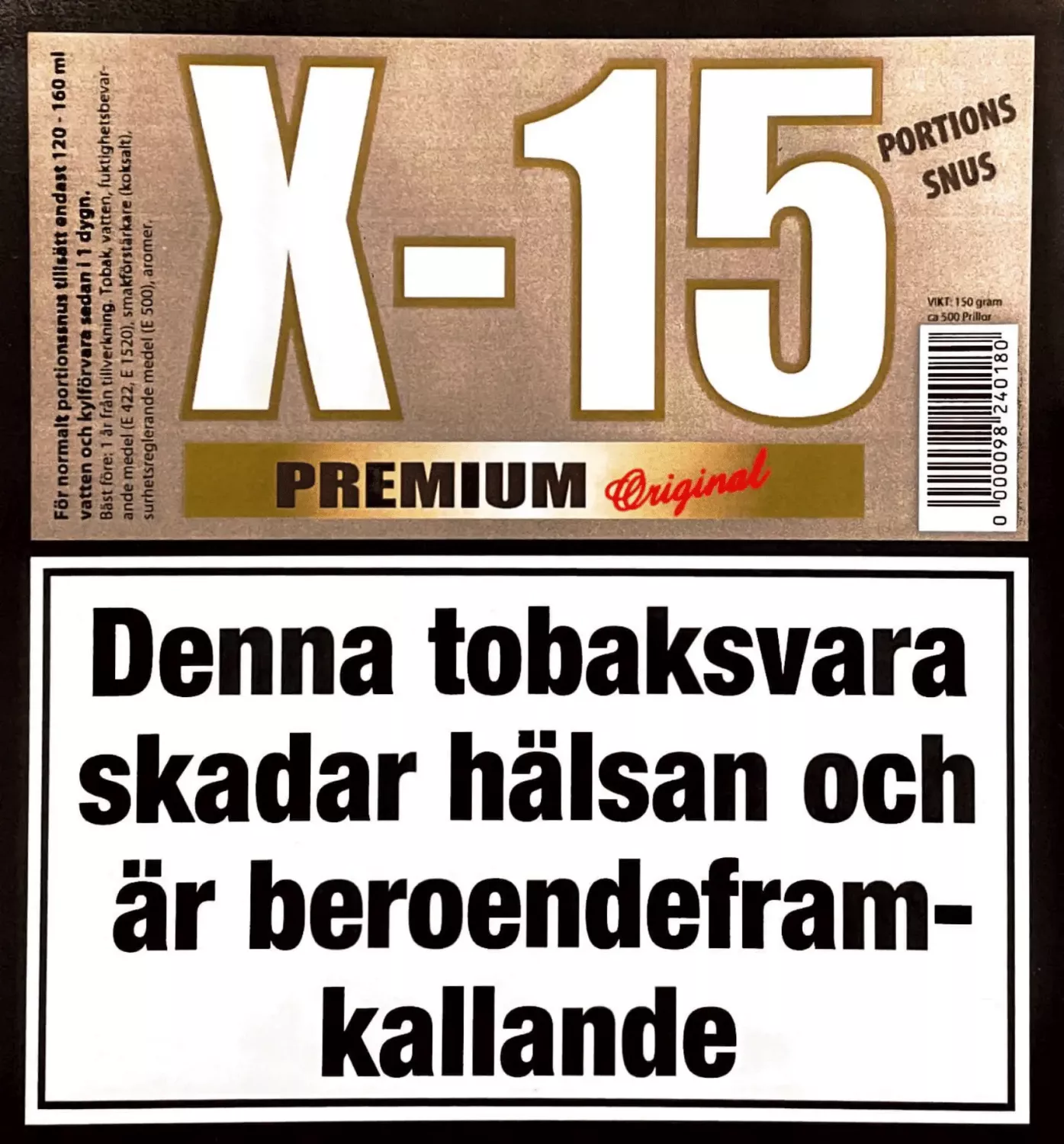 NY VIKT 160g! X-15 Original premium snussats är ett steg upp från standard X-15 Original kit. Detta kit innehåller en tobaksblandning av ännu högre kvalitet och ytterligare naturliga ingredienser, vilket ger dig en mer raffinerad och nyanserad smak. X-15 Original premium snussats kommer också med samma färdigblandade tobak, portionspåsar och instruktioner som originalsatsen, men med en högre nivå av kvalitet och sofistikering. Om du är en sann snuskännare är X-15 Original premium snussats det perfekta valet för dig.