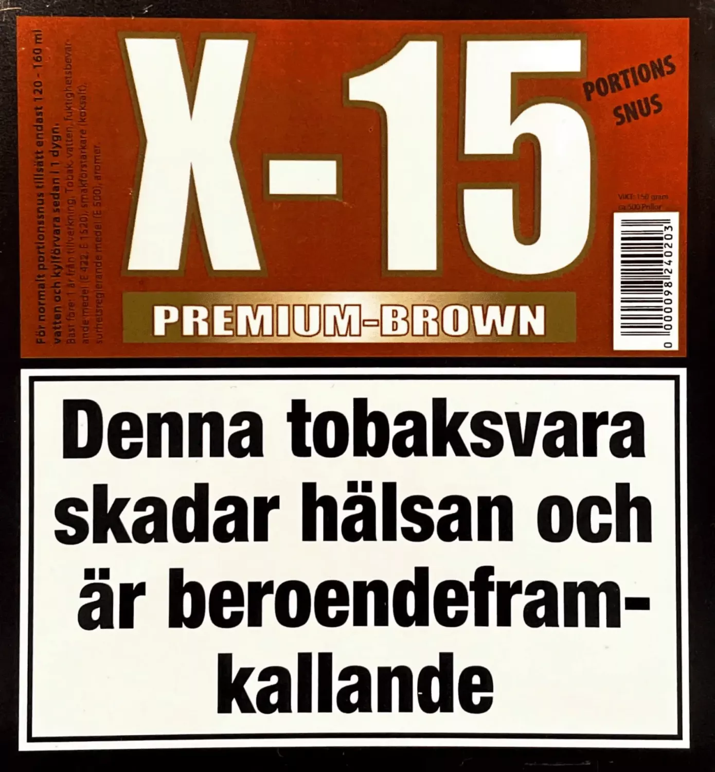 NY VIKT 160g! X-15 Premium brunt snussats är en unik twist på den klassiska snusformeln. Detta kit innehåller en speciell blandning av brun tobak, vilket ger dig en rikare och mer robust smak. X-15 Premium brunt snusset innehåller även andra naturliga ingredienser som förstärker smaken och aromen av tobaken. Med X-15 Premium brunt snusset kan du uppleva den fylliga smaken av premium brunt snus från bekvämligheten av ditt eget hem. Detta kit kommer med färdigblandad tobak, portionspåsar och instruktioner, vilket gör det enkelt att skapa ditt eget läckra bruna snus.